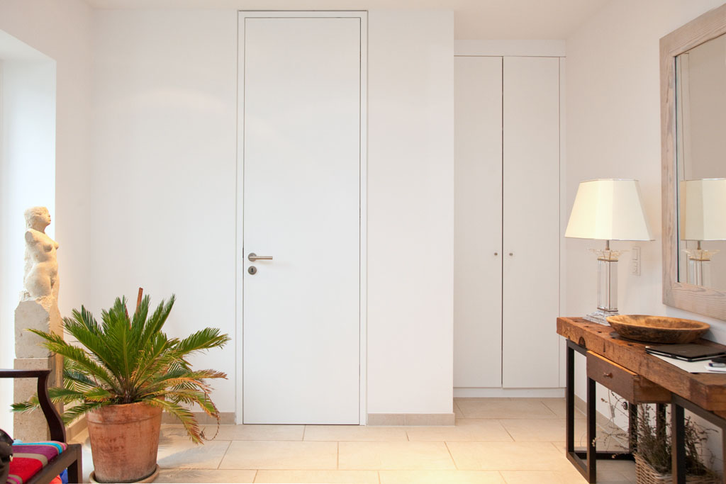 Der Einbauschrank im Bild rechts nutzt die vorhandene Nische perfekt aus. Zusammen mit der raumhohen Durchgangstür zum Wohnbereich entsteht ein harmonisches Gesamtbild.