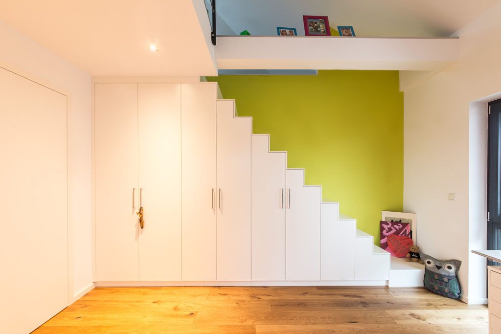Wohin mit der Festtag-Ausrüstung, den Andenken oder sperrigen Reisekoffern, wenn der Dachboden bereits aus allen Nähten platzt und unterm Bett auch kein Plätzchen mehr frei ist? Wir empfehlen eine Einbaulösung unter der Treppe. Vielleicht wie hier im Bild ganz modern-geradlinig, farbenfroh und ganz viel Stauraum.