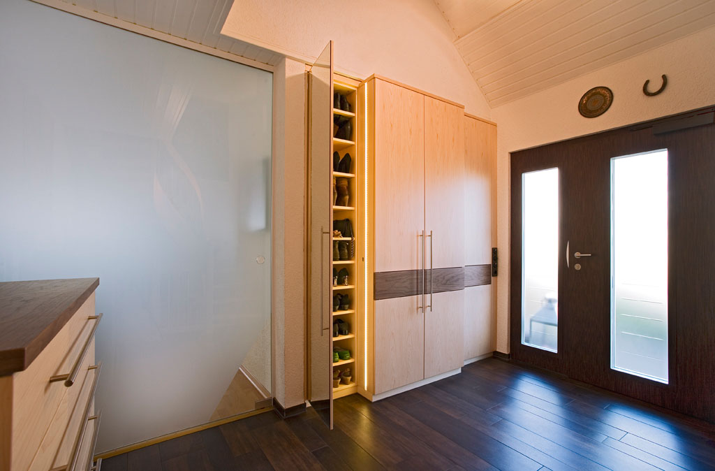 Ein massiver, eingepasster Schrank bietet mehr als genug Platz und Funktionsbereiche für Schuhe, Jacken, Mützen, etc., der Bewohner. Der Hauseingang ist groß genug, das Möbel wirkt trotz seiner Dimension nicht wuchtig.