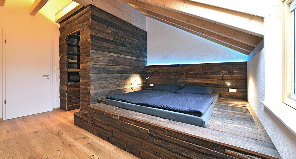 Die Schreiner haben die einzelnen Eiche-Altholz-Schwarten der Schlafzimmereinrichtung in Kleinarbeit zu kompletten Möbeln wachsen lassen. Der begehbare Kleiderschrank ist großzügig mit Kleiderstangen und grauen Regalfächern