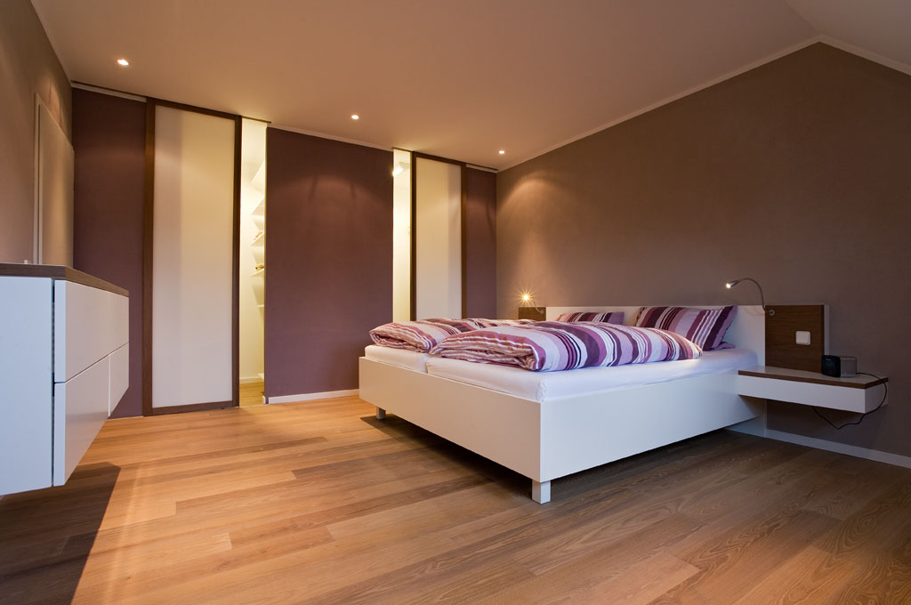 Plane Gleittüren mit Füllung in Satin Nussbaum und eingelassenem, weiß lackiertem Glas als Sprossenelement, kontrastiert mit passendem Nussbaumbett mit ledernem Kopfteil. Die Holzmaserungen stehen in einem tollen Kontrast zur schlichten Wandgestaltung.