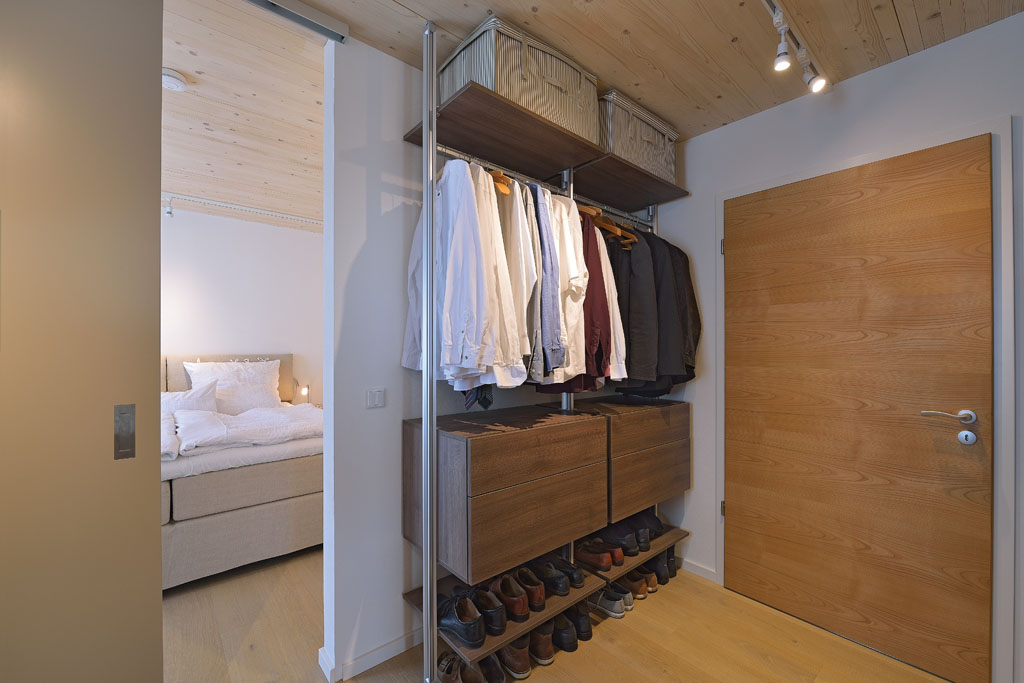 Zwischen Bad und Schlafzimmer befindet sich die Ankleide. An den Wänden ist ein flexibles Aluprofil-System mit Kleiderstangen sowie Schubfächern und Regalböden in Nussbaum für die Garderobe der Bewohner installiert. Die Tür rechts im Bild führt zu den Wohnräumen.