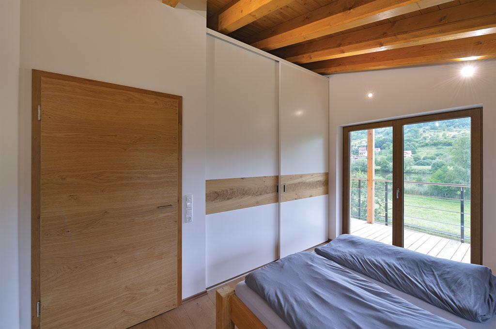 Begehbarer Kleiderschrank im Schlafzimmer. Davor: weiß lackierte Holzgleittüren mit Einlegern in Eiche, natürlich geölt.