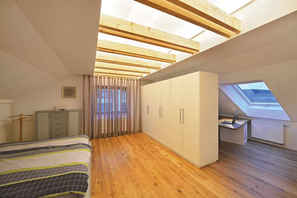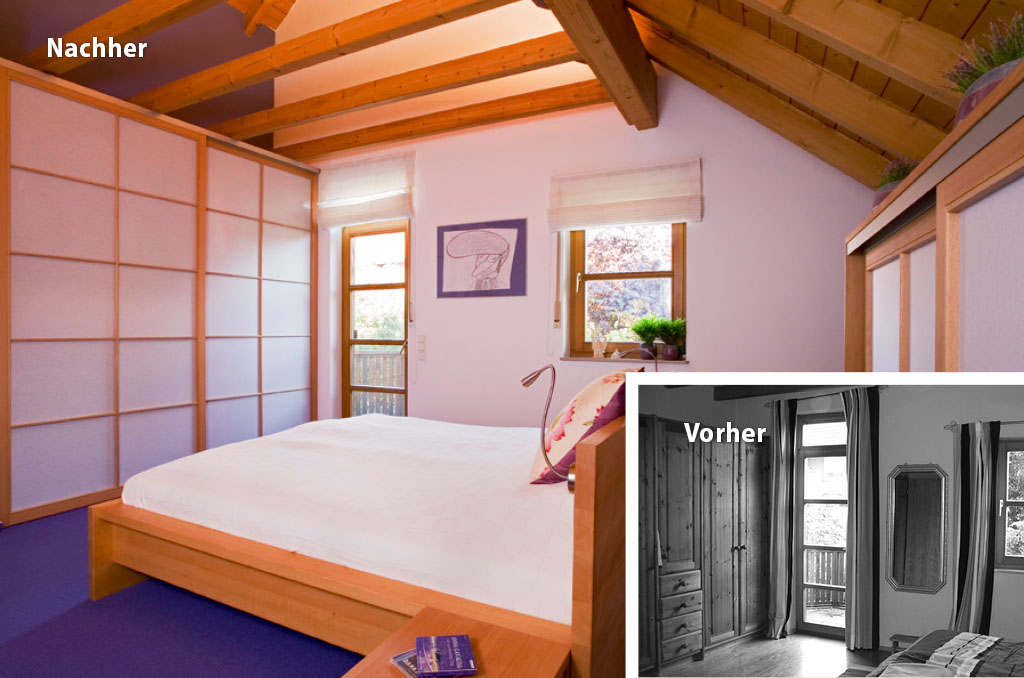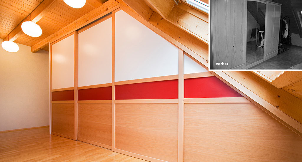 Nachher: Durch die harmonische Holz- und Farbauswahl fügen sich die neuen Schränke mit Gleittüren nun ganz ausgezeichnet in die Dachschräge.