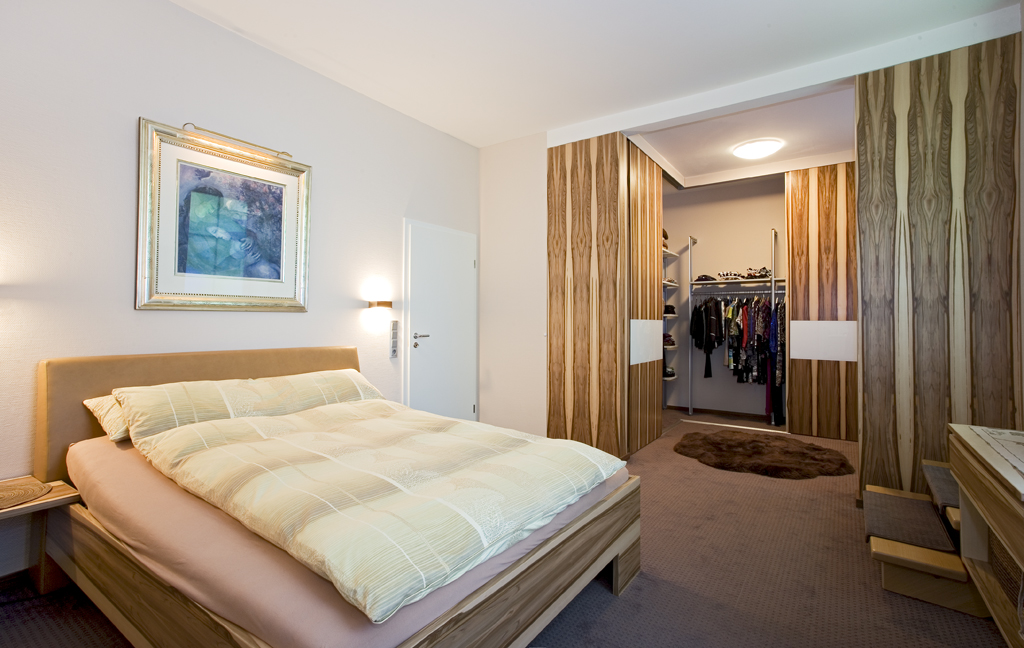 Steht ausreichend Raum zur Verfügung, machen wir Ihren Kleiderschrank begehbar. Es entstehen eigenständige, in sich abgeschlossene Ankleidezimmer. Die Einbaumöbel sind aus edlem Nussholz gefertigt, das Innenleben mit Schubkästen, Regalböden und Kleiderstangen individuell auf die Bewohner abgestimmt.