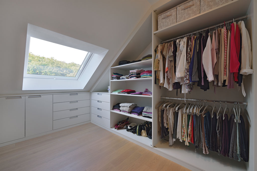 Der begehbare Kleiderschrank öffnet sich durch eine Spiegel-Gleittür und ist mit verschiedenen Ordnungssystemen, speziell für Dachschrägen, ausgestattet.