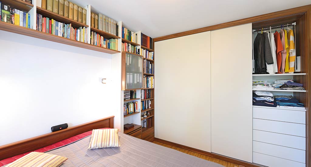 Maßgefertige Einbauschränke in Weißlack auf ganzer Breite. Das Bett ist samt Elektronik mit dem Kopfende an einer Wohnwand angegliedert, die rückseitig zusätzlich als begehbare Ankleide fungiert.