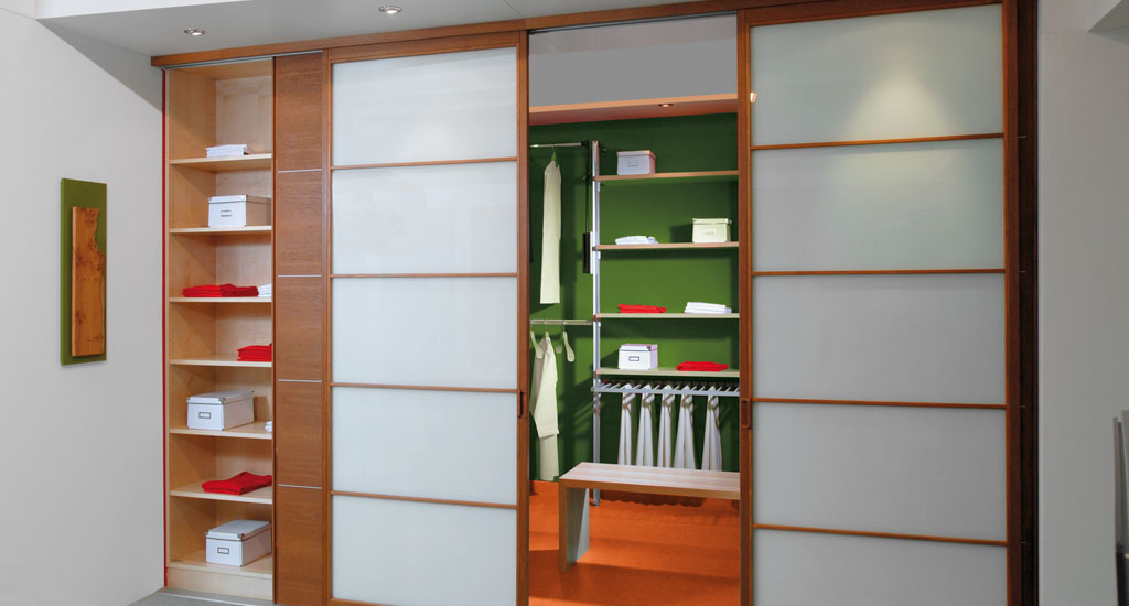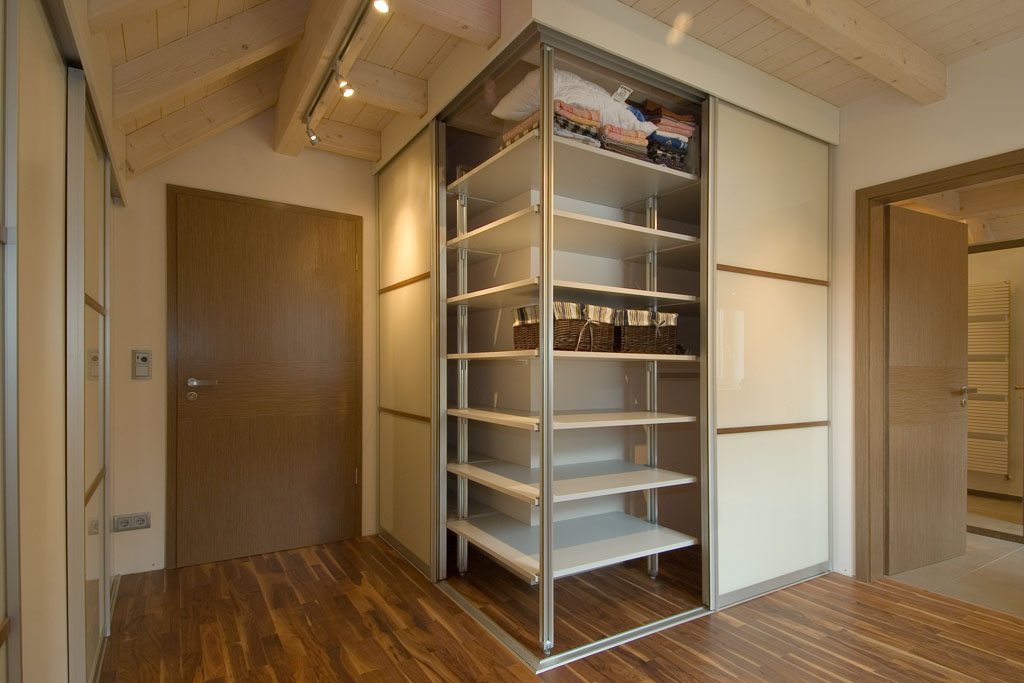 Alu Gleittüren mit weiß lackierter Glasfüllung vor individuell gestaltetem Regalsystem.