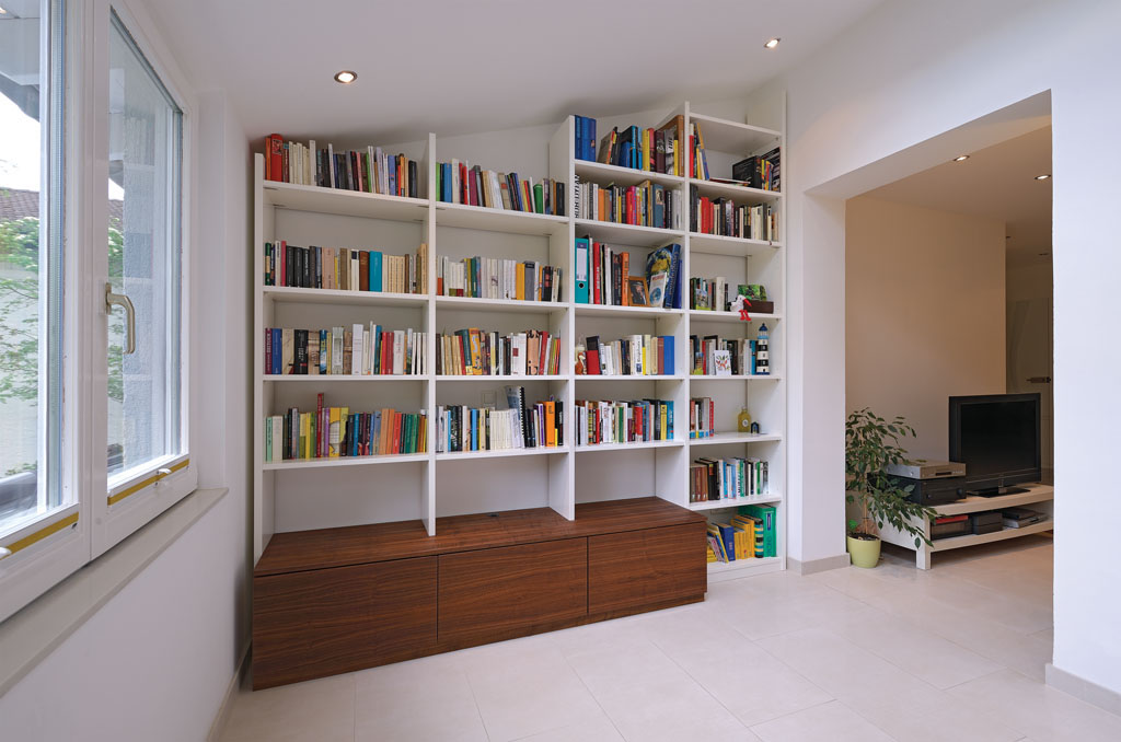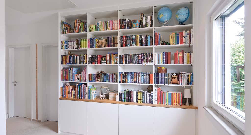 Große Regalwand in dezentem Weiß für mehr Helligkeit und Kontraststärke zur bunt gemischten Büchersammlung. Die Rückwand der TV-Aussparung schließt nicht ganz an der Wand ab und bietet dadurch rückseitig den nötigen Platz für die versteckte Kabelführung.