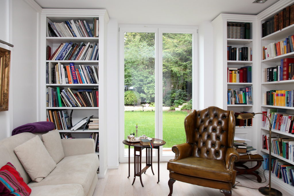 Hier sitzt alles. Maßgenau eingebaute Regalwände im Stil der modernen Klassik. Der gemütliche Lesesessel und die Couch bilden den idealen Raum für ruhige Stunden.