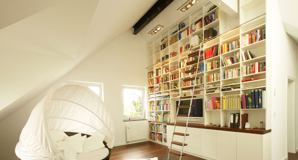 Individuell geplante Regalwand im Wohnzimmer in der Dachschräge aus weiß lackiertem Holz und großen Schubläden mit viel Platz fürs Hab und Gut.