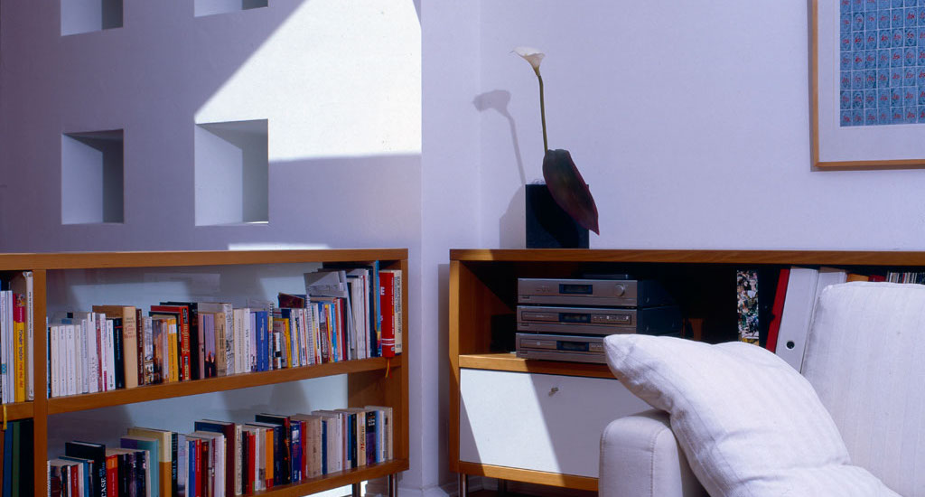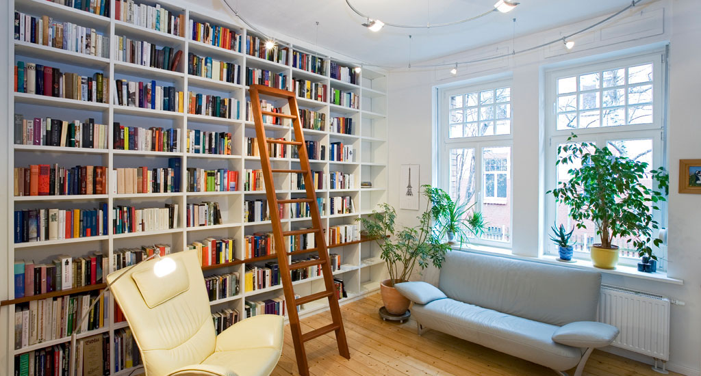 Ein Einbauschrank mit ausreichend Platz für Literaturbegeisterte und ihr Hab und Gut, natürlicher Dielenboden und passende Sitzmöbel für ungestörte Stunden voll Lesespaß. Passende Lichtkonzeption inklusive.