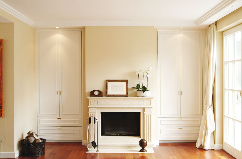 Einbaumöbel sind das Mittel der Wahl, wenn es darum geht, Funktionalität und Stauraum nur bei Bedarf zugänglich zu machen. Dieses belegt das Kaminzimmer auf dieser Seite. Alles ist ordentlich aufgeräumt und doch jederzeit zugänglich.