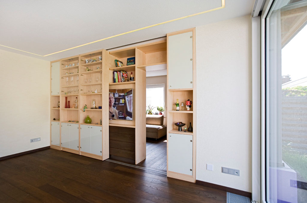 Wohnzimmerausbau mit TV-Board und Hifi-Möbel im neu gebauten Massivholzhaus.