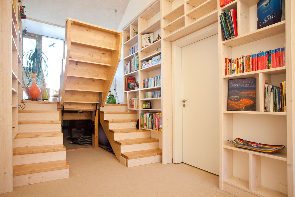 Die Treppe zur Galerie fängt alle Blicke im Raum - wie die Bücherwand wurde sie passgenau in den Raum geplant und montiert - ein Leseratten-Traum in massivem Birkenholz.