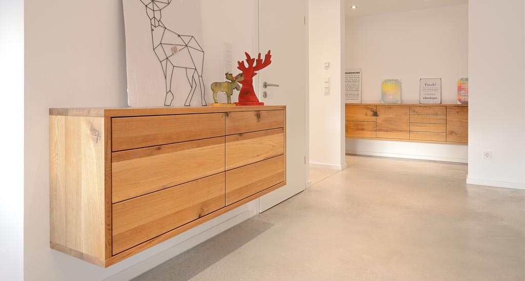Modern gestaltete Hängesideboards im Flur zwischen Hauseingang, Esszimmer und Wohnzimmer in wildem Eiche Massivholz. Es wurde für das flächige Bild auf Beschläge verzichtet, die Schubkästen öffnen sich mit einem Fingertipp.