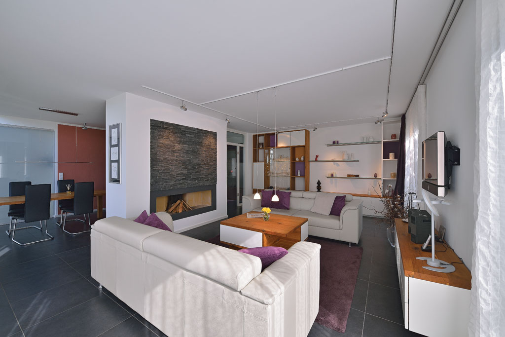 Mit vielen weißen Möbelelementen und der ebenfalls weißen Wandgestaltung entstand der nötige Raum für die kräftigen Kontraste mit dem Holz, dem dunklen Fliesenboden, den lila Textilien und dem mächtigen Kamin.