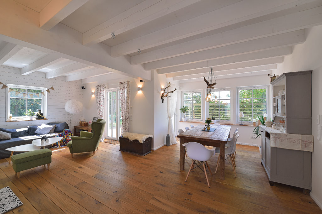 Der Eichendielenboden setzt mit seiner Schlichtheit einen natürlichen Kontrast im Raum. Die Wandverkleidung hinter der Eckcouch ist ein Klassiker aus den Staaten: Das „Bead-Board“ ist Hollywood-Fans vielleicht ein Begriff. Alles perfekt mit einem individuellen Lichtkonzept in Szene gesetzt.
